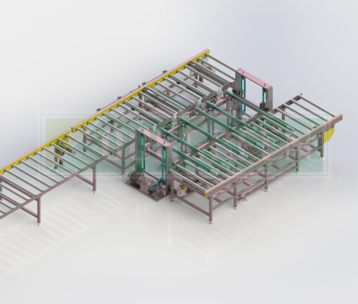 南京歐格設(shè)計(jì)制造的后續(xù)自動(dòng)化生產(chǎn)線使用機(jī)械推手將板材推入碼垛堆疊,堆疊成包裝要求高度,輸出打包。